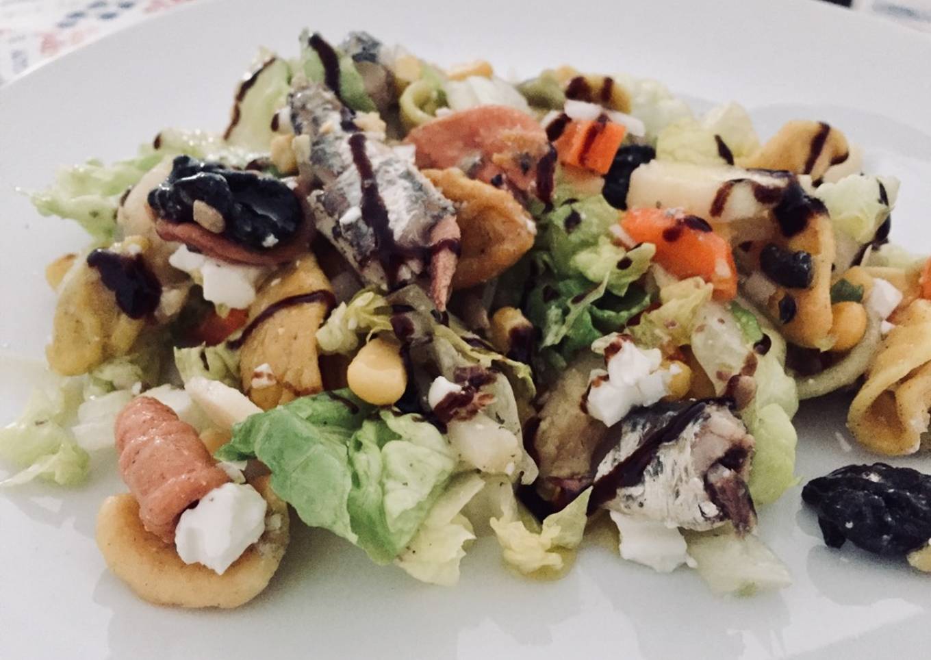 Además de comer pescado azul, en casa odio tirar nada. Había hecho pasta de colores de lidl el día anterior y había sobrado un poco, así que hicimos ensalada de pasta súper completa para comer