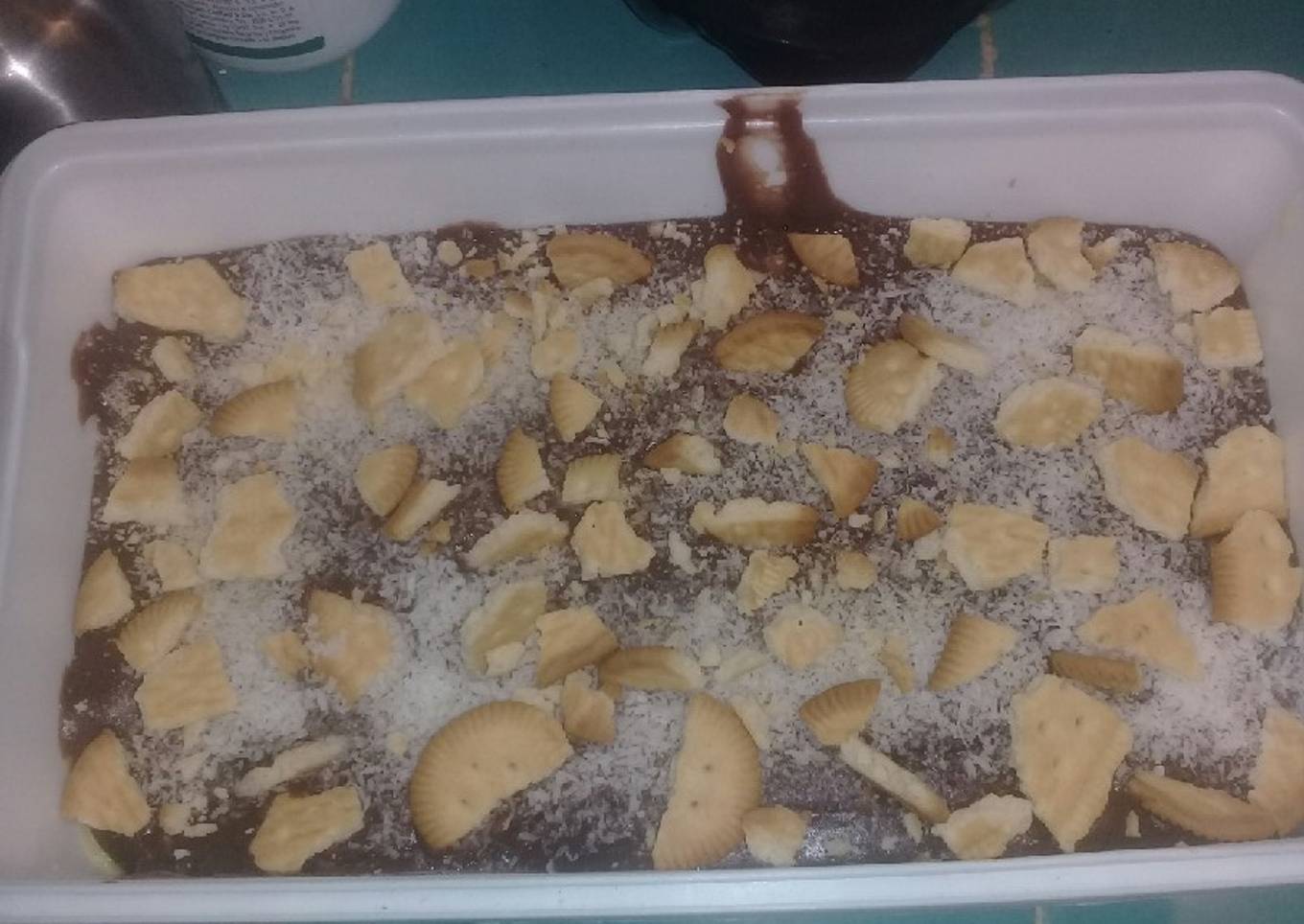 - Colocar en la olla la maicena y el cacao, unir los 2 y disolverlos con un poco de leche, luego de disuelto le agregas el resto de la leche, el edulcorante y si se quiere unas gotitas de vainilla, llevar a fuego y revolver constantemente hasta que espese, llevar y colocar sobre la otra crema y el colchón de galletas, por encima colocar coco rallado y galletitas.