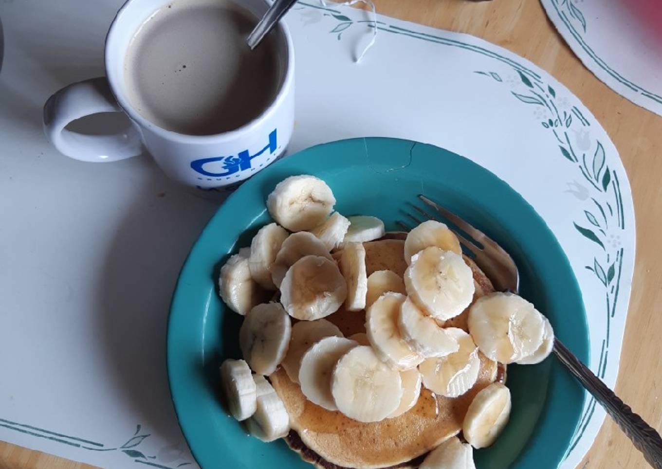- Una vez listos los hot cakes, cortar 1/4 de plátano en láminas delgadas y servir con leche o café.