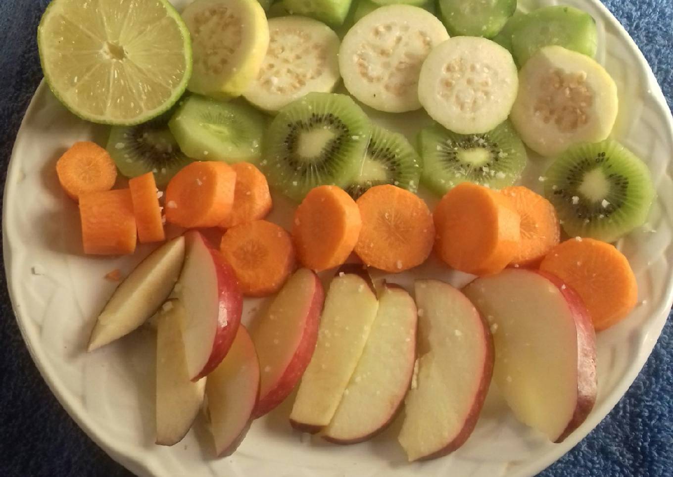 - Lava todo muy bien, pela el pepino la zanahoria y kiwi. Corta en rebanadas acomoda bonito y agrega sal limón.