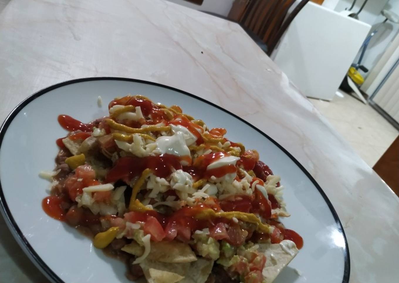 - Hecho todos estos pasos, solo falta poner los frijoles en un plato, después colocar los totopos que hicimos, el guacamole, ponerle el queso, la mayonesa, la mostaza y la catsup, y listo